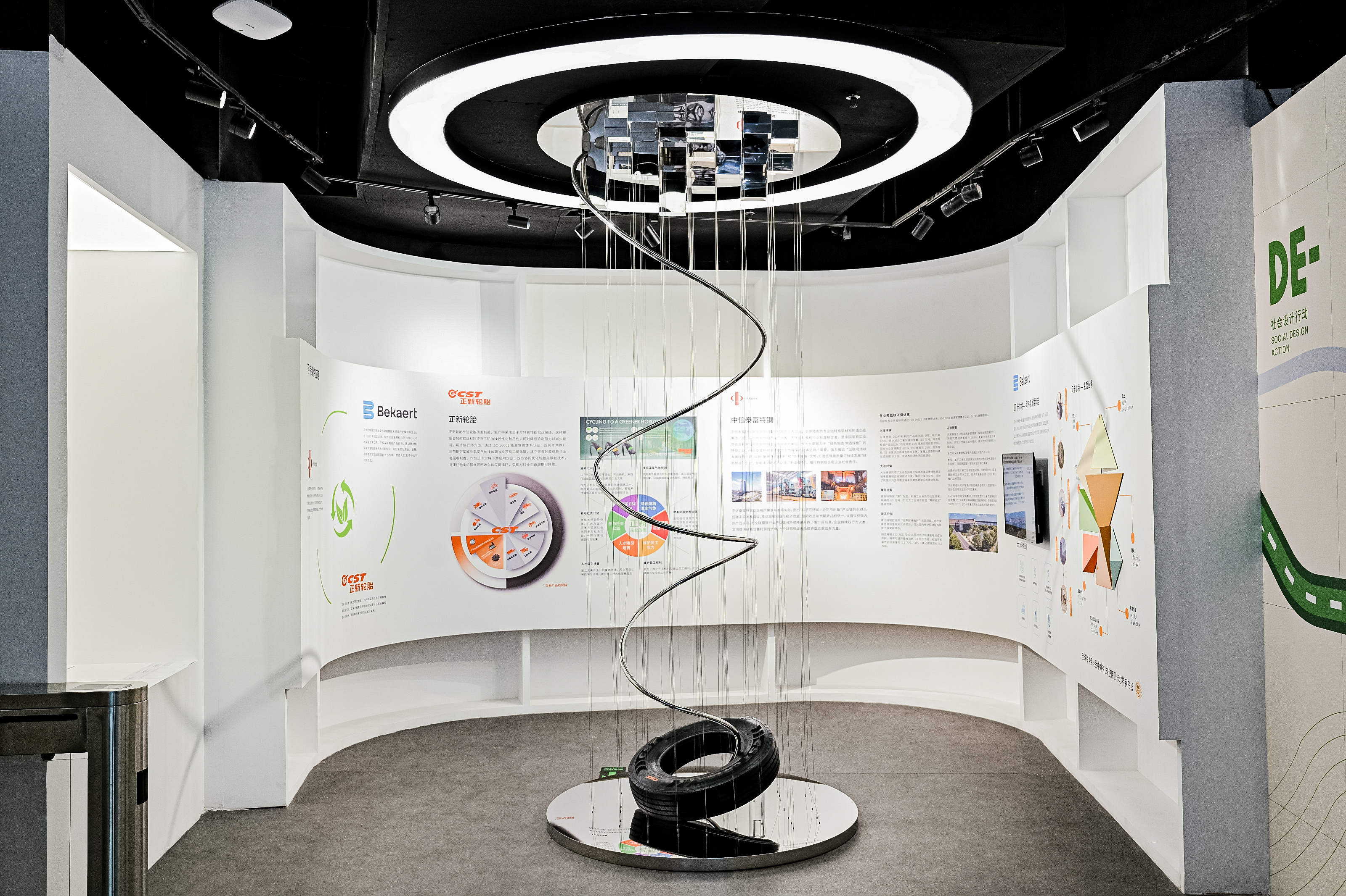 展区从供应链流程展示、装置艺术设计、可持续主题展品社会设计三个维度出发,全方位阐释“在前行中迭代、在发展中精进”的可持续发展理念。